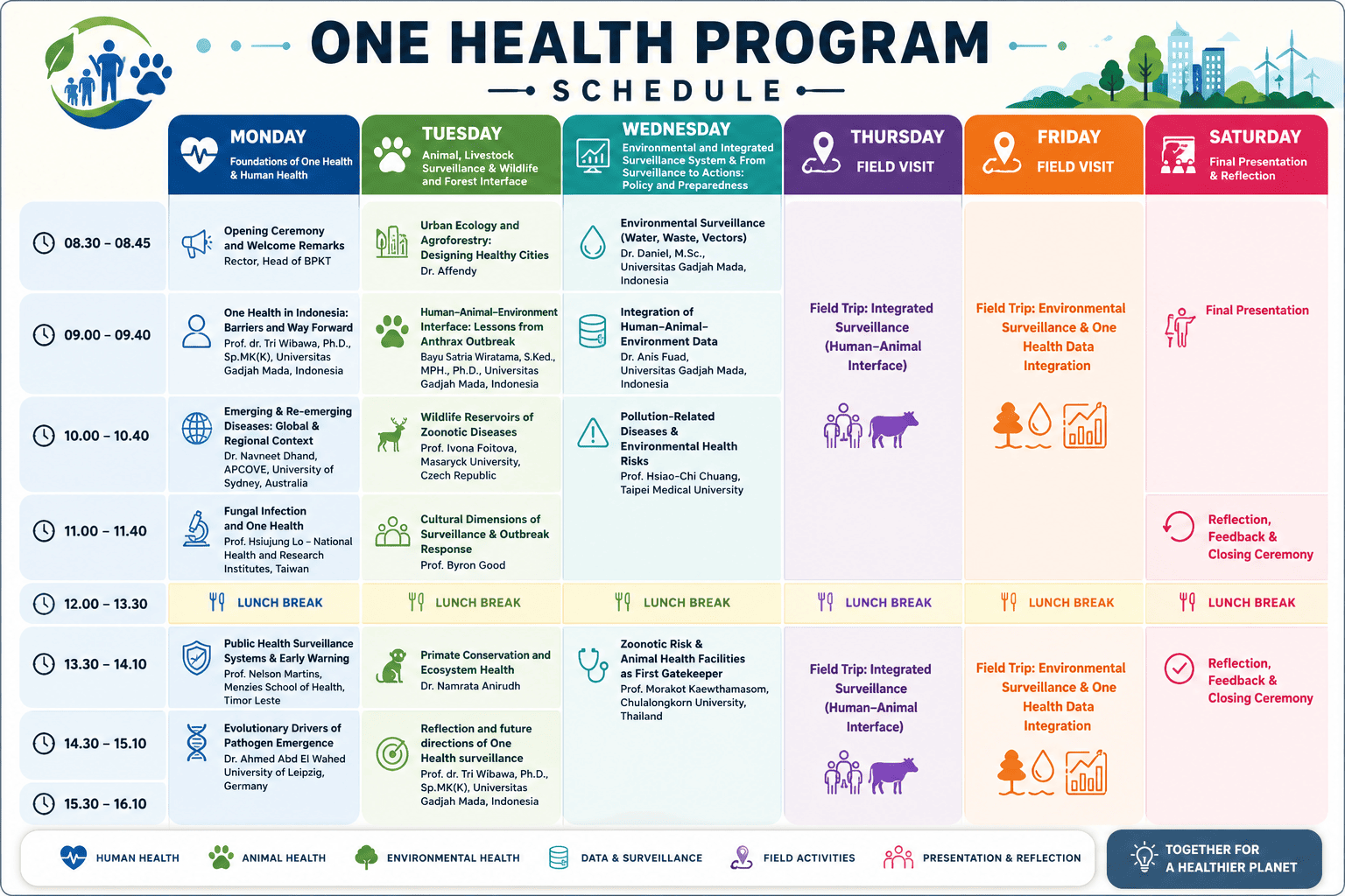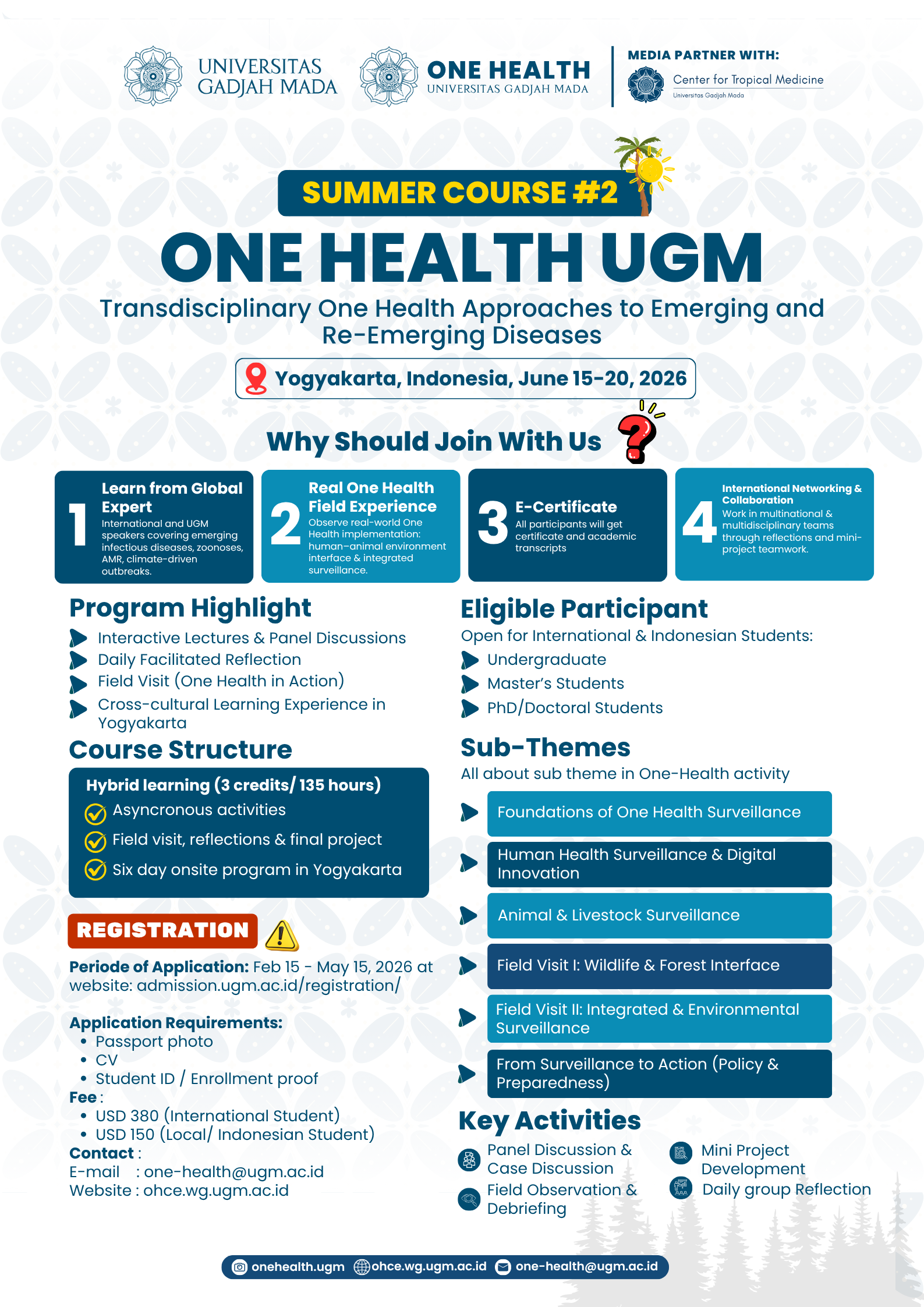 The program further enriches the learning experience through field visits to locations where One Health approaches are actively implemented at the human-animal-environment interface—such as in disease surveillance systems, livestock management facilities, or ecosystem monitoring sites. In addition, students will collaborate closely in multinational and multidisciplinary teams to develop a mini-project, allowing them to directly apply their newly acquired knowledge to tangible challenges in disease prevention, surveillance, and control. The course adopts a hybrid learning model equivalent to 3 credits or 135 total hours of student work, effectively combining pre-arrival asynchronous activities such as guided readings, video lectures, and preparatory assignments with the intensive, hands-on on-site component in Yogyakarta. Upon successful completion of the program, participants will receive an e-certificate and an official academic transcript as formal recognition of their achievements. Moreover, they will gain valuable opportunities to build an international professional network, connecting with peers, experts, and institutions from around the world.